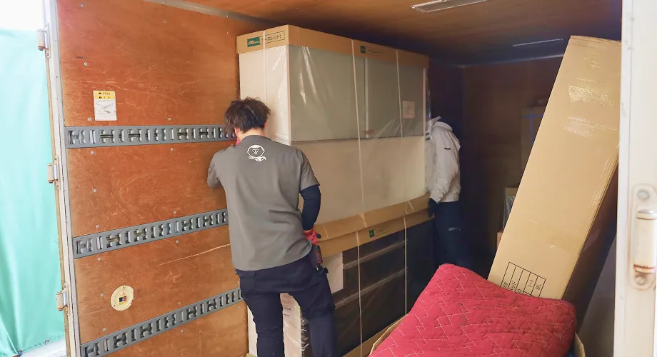 荷物を一緒に運びます。研修の最初は比較的軽い家具から。先輩に持ち方や持ち上げるコツなどを学びます。徐々に重い荷物も持てるようになります。