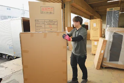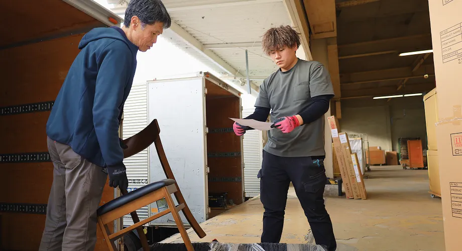 倉庫: 家具を納品してくるトラックからの荷下ろしと、その商品の仕分け作業です。配送分の荷物のチェックや倉庫整理などもあります。